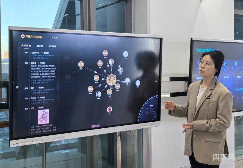 山东数字文化集团展厅内,屏幕上展示的齐鲁文化大模型实现了科技与文化的创新融合。(央广网记者刘佳音摄)