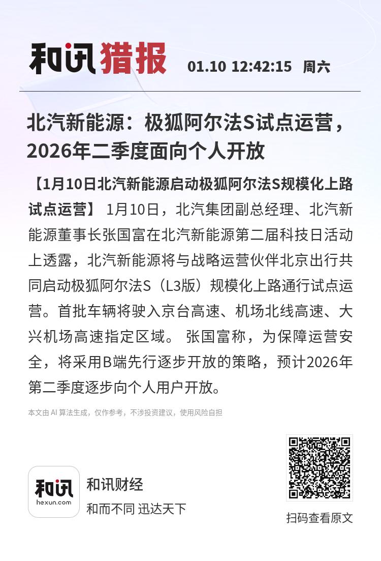 1月10日,北汽集团副总经理、北汽新能源董事长张国富在北汽新能源第二届科技日活动上透露,北汽新能源将与战略运营伙伴北京出行共同启动极狐阿尔法S(L3版)规模化上路通行试点运营。首批车辆将驶入京台高速、机场北线高速、大兴机场高速指定区域。张国富称,为保障运营安全,将采用B端先行逐步开放的策略,预计2026年第二季度逐步向个人用户开放。