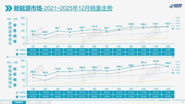 具体来看,受车购税免税政策到期影响,新能源零售创历史新高。数据显示,12月新能源乘用车市场零售133.7万辆,同比增长2.6%,环比增长1.2%,新能源车国内零售渗透率达到59.1%,较去年同期提升9.6个百分点。
