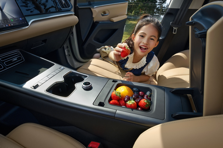 新车围绕家庭出行场景,构建了覆盖乘员关怀、旅途舒享、智能交互的立体生态。与好孩子联合开发的智能儿童安全座椅支持车机互联与语音控制,上车自动旋转迎宾,抱娃入座更安全便捷;融合倍轻松智能颈部按摩仪与眼罩,通过车机一键启动,为长途驾驶提供即时放松。