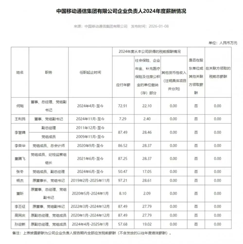 中国移动2024年度时任董事长、党组书记的杨杰为97.21万元、何飚为72.91万元。原总经理、党组副书记董昕2024年度应付年薪为8.10万元。副总经理、党组成员李慧镝应付年薪为87.49万元。