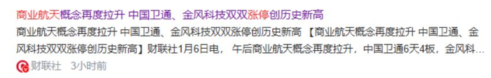 1月6日午后,商业航天有一次上攻,个股掀起了涨停潮,多达24股涨停,中国卫通6天4板,金风科技走出7天3板,中国卫星逼近涨停,三股均创历史新高。