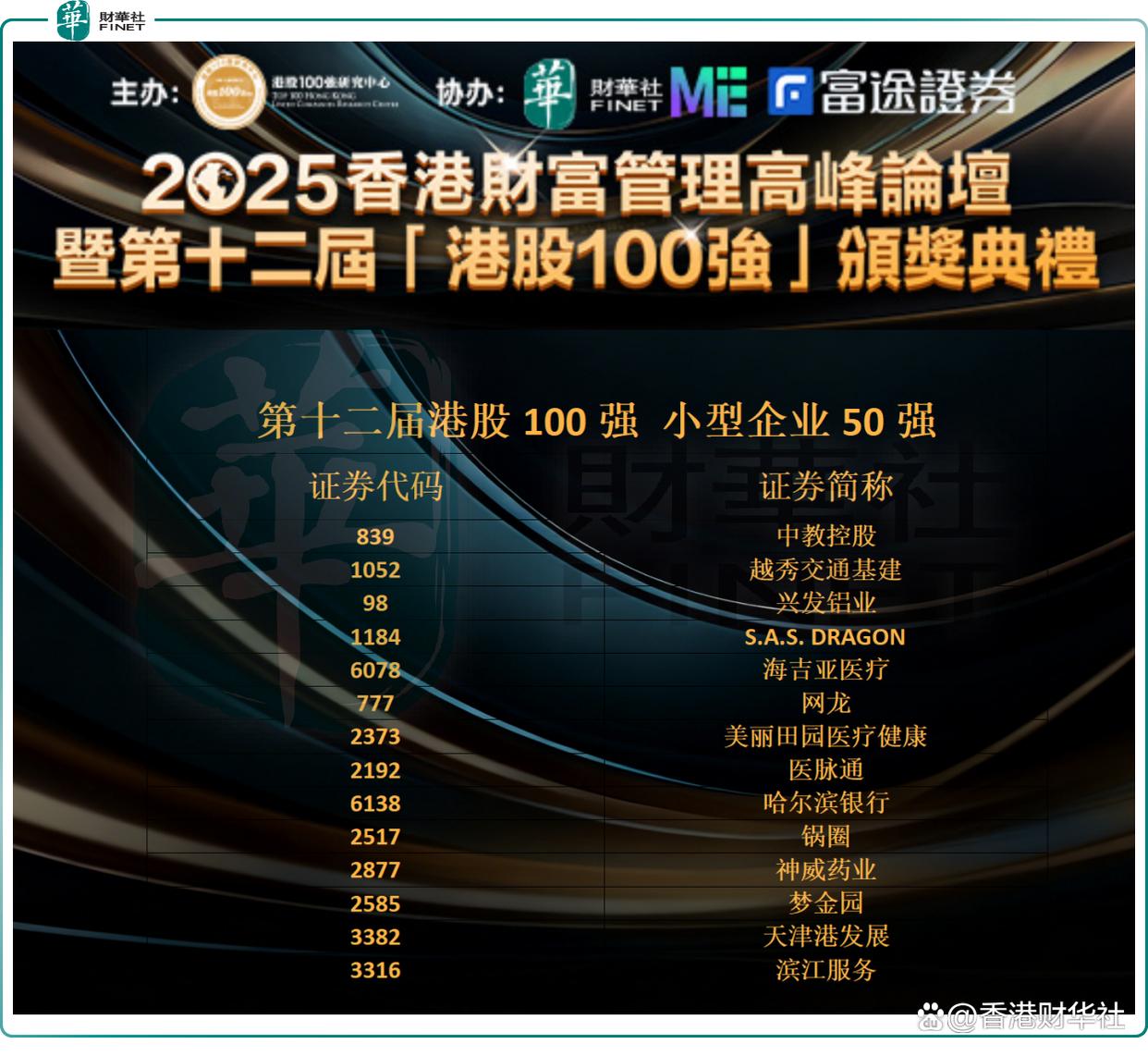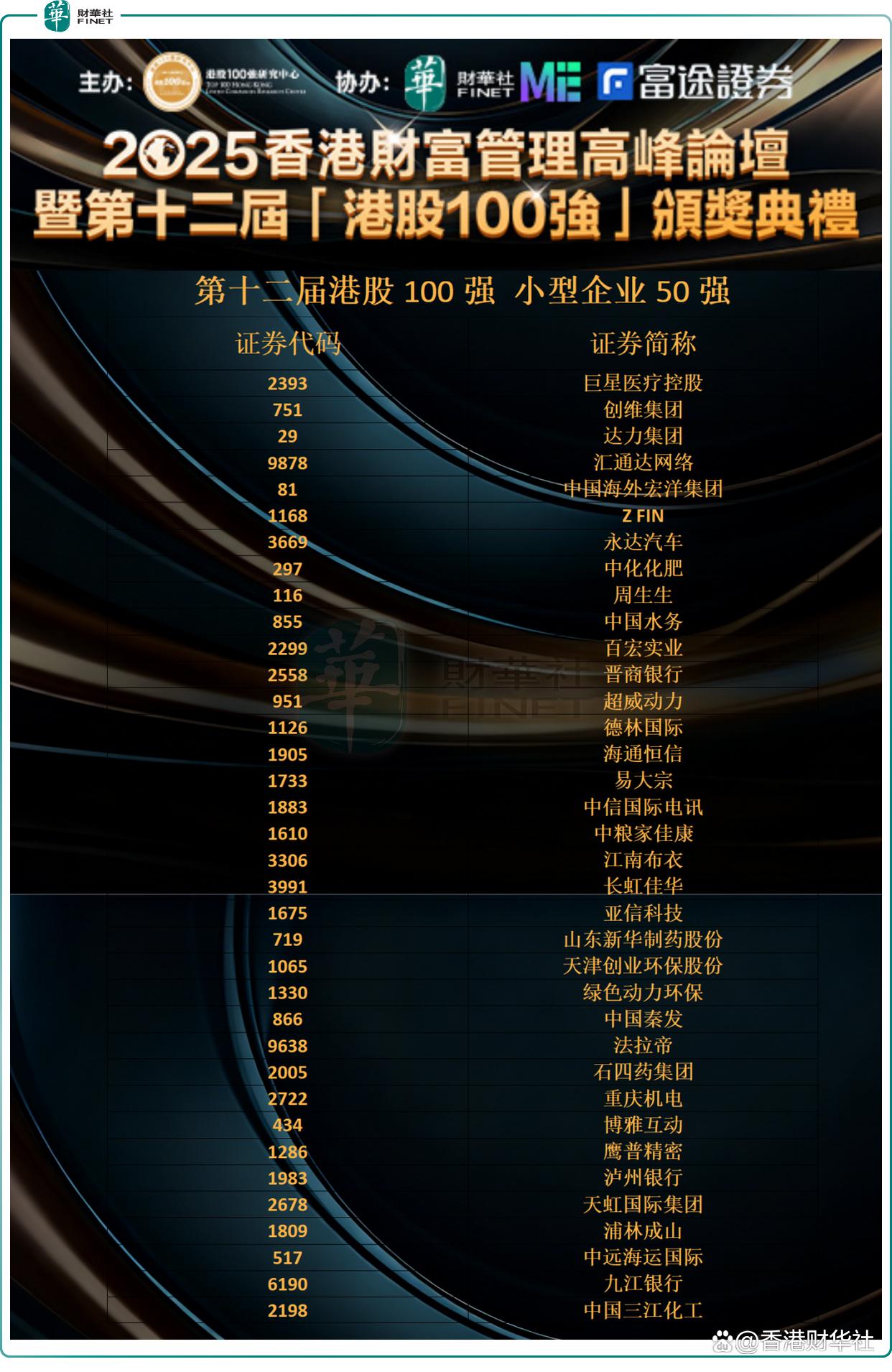 以下是第十二届港股100强“小型企业50强”榜单获奖企业名单(50名):