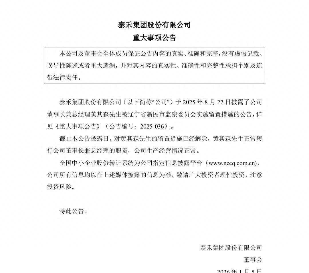 就在1月5日,泰禾集团发了一纸公告,确认董事长黄其森的留置措施已经解除,官复原职。这一幕,熟悉泰禾的朋友恐怕都会有一种强烈的“既视感”。