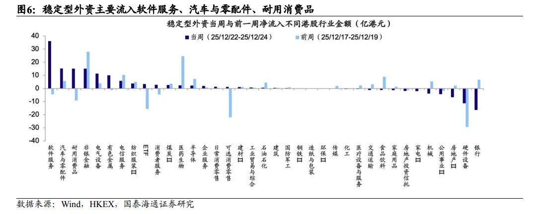 而实际上,据国泰海通跟踪研究,2025年最后一周,长线外资就已提前积极增配港股软件、电信、有色金属等行业,当周稳定型外资流入达83亿港元。