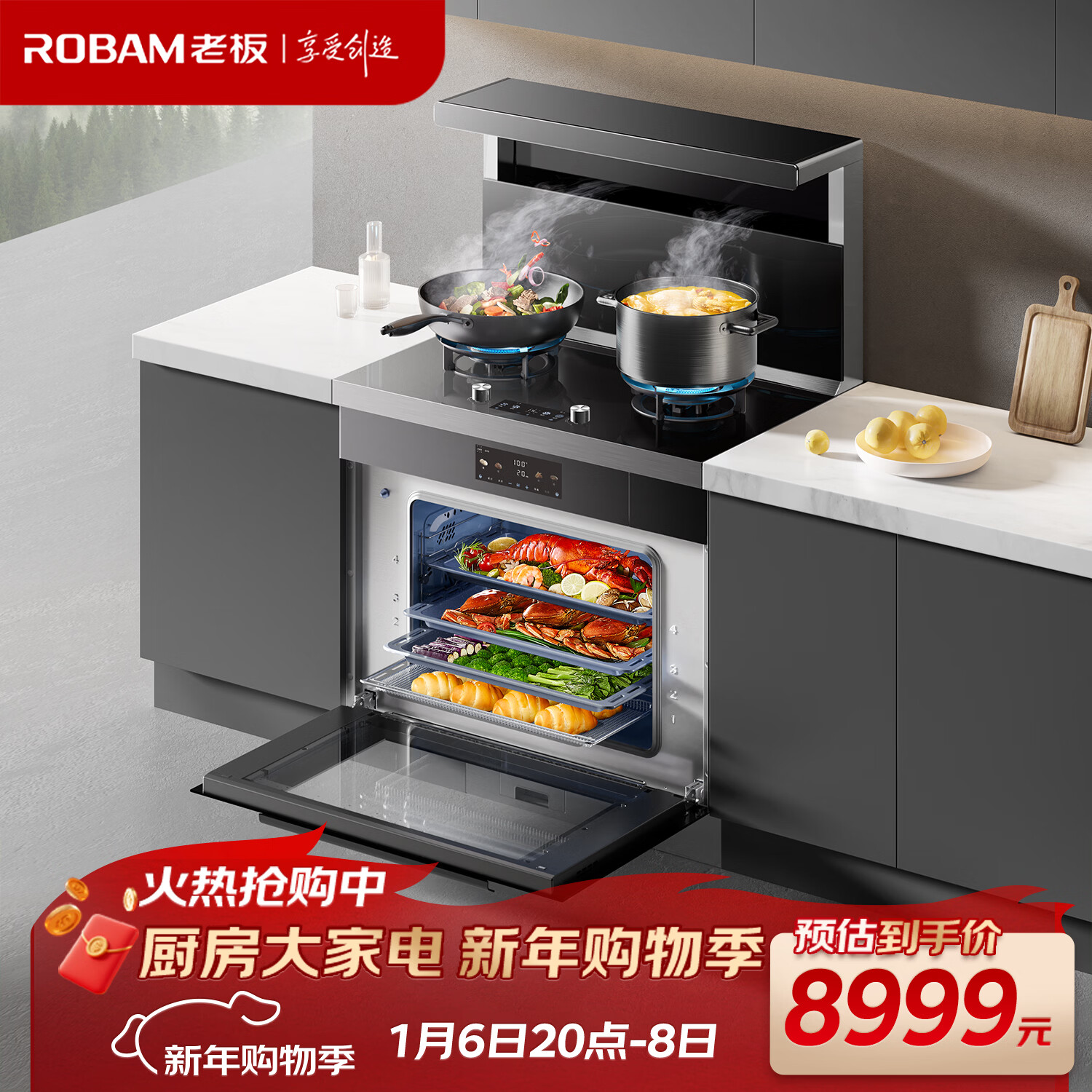 老板(Robam)黑武士9JC22A集成灶 83L蒸烤炸炖集成灶一体式 28风量油烟机定时燃气灶天然气右排烟集成灶