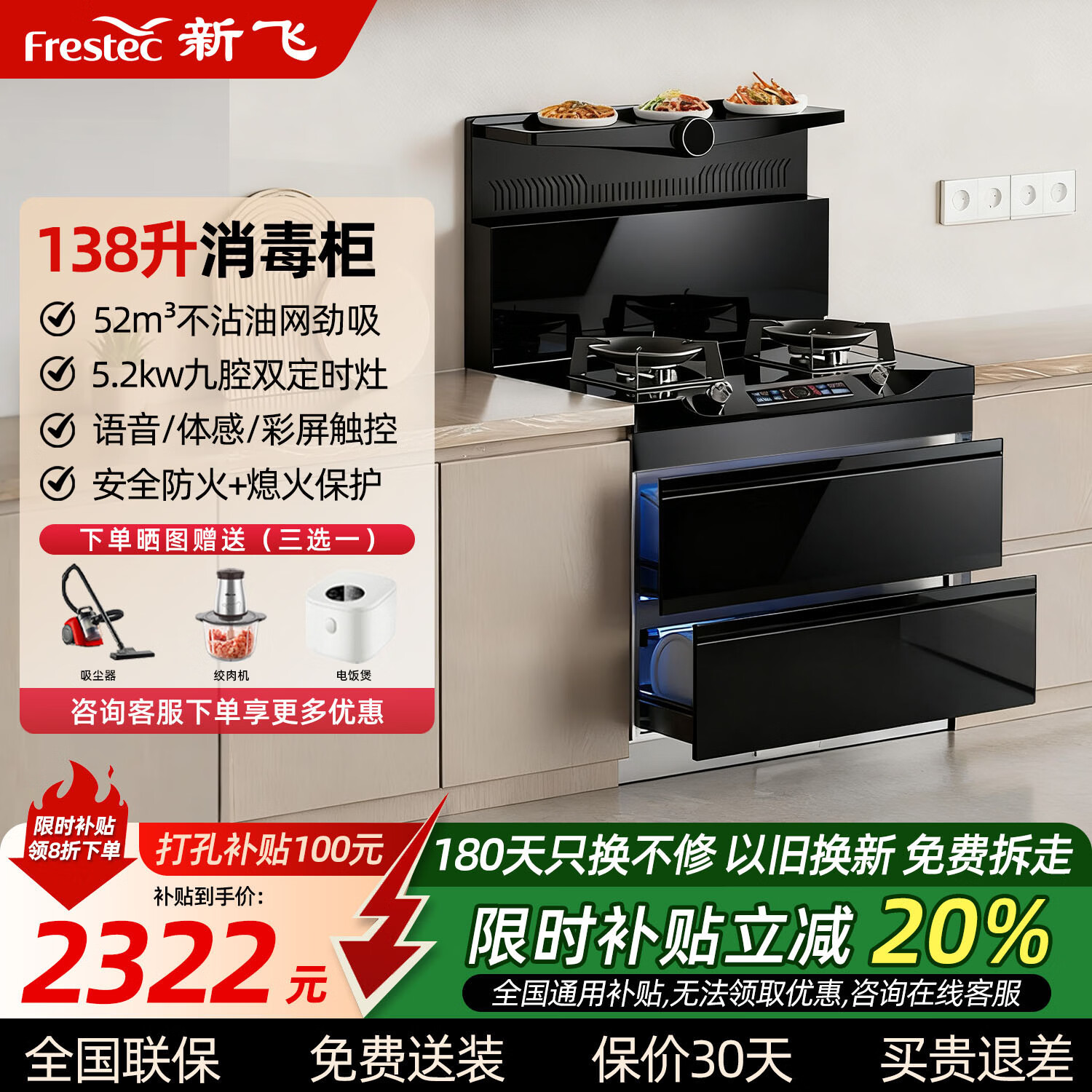新飞(Frestec)集成灶家用厨房蒸烤炖炸侧吸式下排一体灶油烟机燃气灶具煤气灶消毒柜套装烟灶套餐自动洗可订后排消毒柜款【创新不沾油表面】语音彩屏左右独立定时灶天然气12T