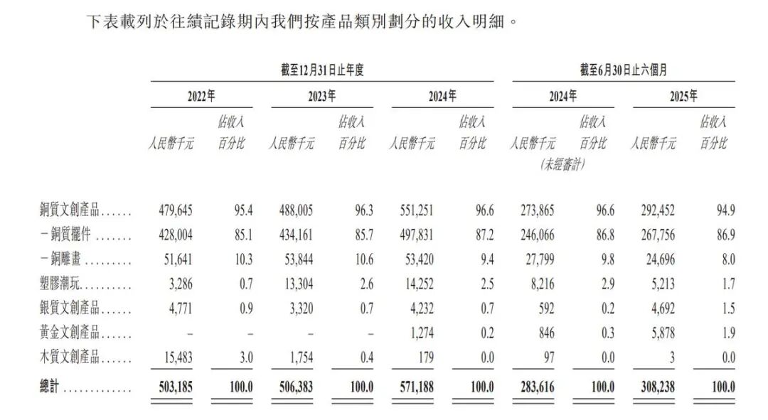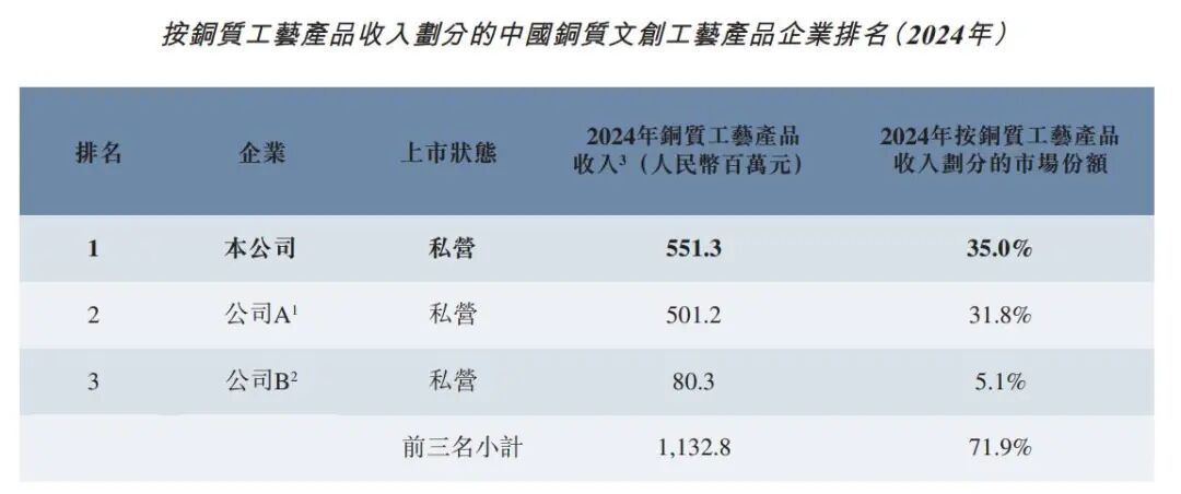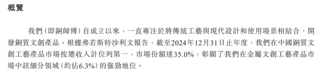 在最新招股书中显示,截至2024年底,其在中国铜质文创工艺产品市场的占有率高达35.0%,线上市场份额更达44.1%。