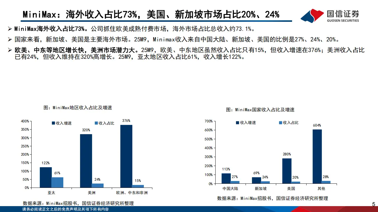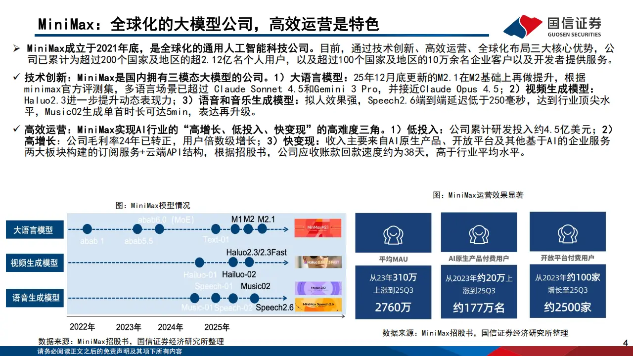 MiniMax成立于2021年底,是一家布局多模态的全球化大模型公司,总部位于上海,业务覆盖超过200个国家及地区,累计服务超2.12亿名个人用户和10万余名企业客户,海外收入占比达73%,其中新加坡、美国市场占比分别为24%、20%,欧美、中东及美洲地区保持高速增长。