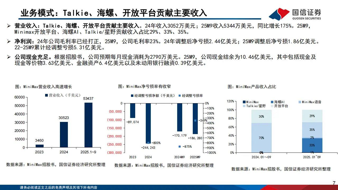 财务表现方面,公司收入高速增长,2024年收入3052万美元,2025年1-9月收入达5344万美元,同比增长175%。盈利状况持续改善,2025年1-9月毛利率转正至23%,其中开放平台毛利率69%,AI原生产品毛利率提升至5%,亏损率大幅收窄,现金储备充足,为业务持续扩张提供支撑。