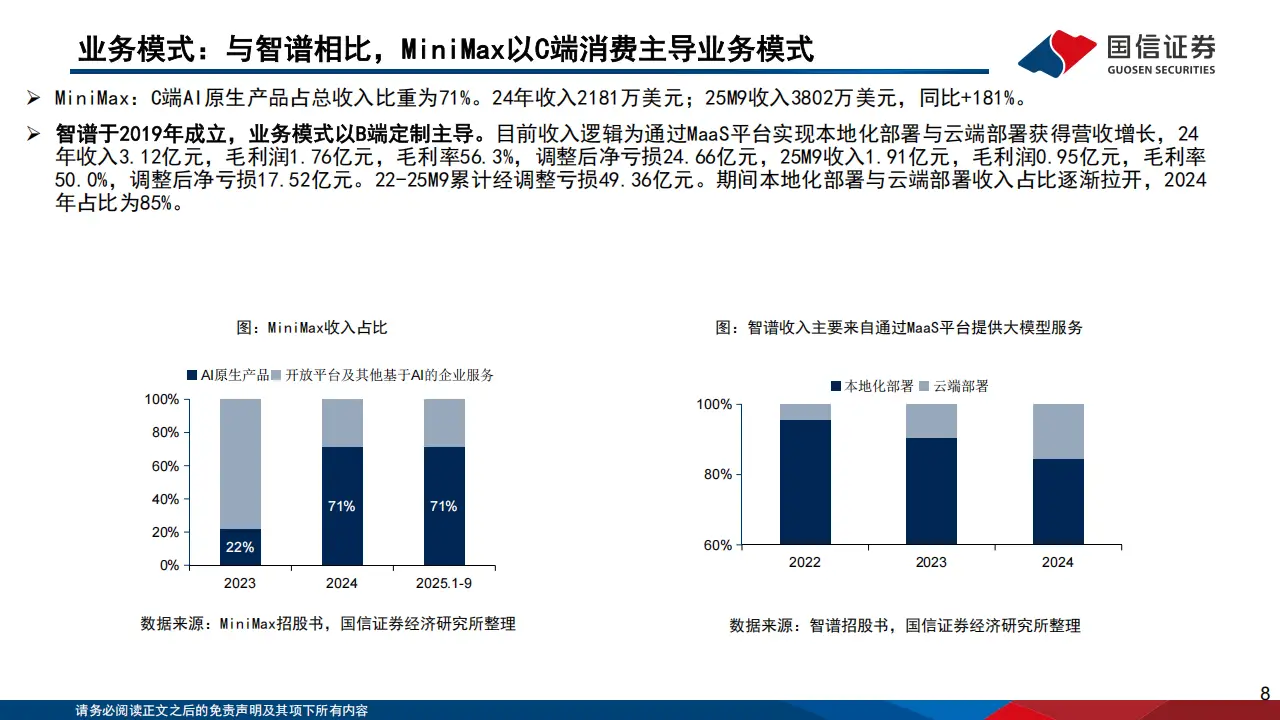 业务布局涵盖C端AI原生产品与B端开放平台,AI原生产品收入占比71%。C端产品中,海螺AI视频以高性价比和丰富场景模板深受用户喜爱,25年9月收入1746万美元;Talkie/星野作为AI陪伴产品,融合二次元文化与卡牌收集机制,在欧美市场广受欢迎,月活用户达2000万;MiniMax语音与通用智能体Agent则分别覆盖音频生成和长程任务处理场景。B端开放平台整合全模态能力,提供灵活定价方案,25年9月收入1542万美元,同比增长160%。