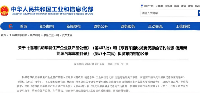 1月8日,工信部发布了第403批《道路机动车辆生产企业及产品公告》,这也是2026年的第一批新车。