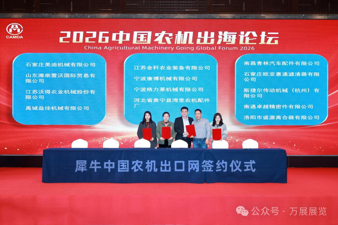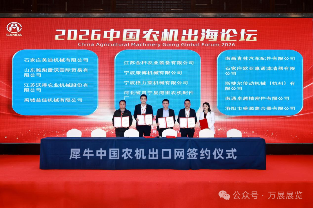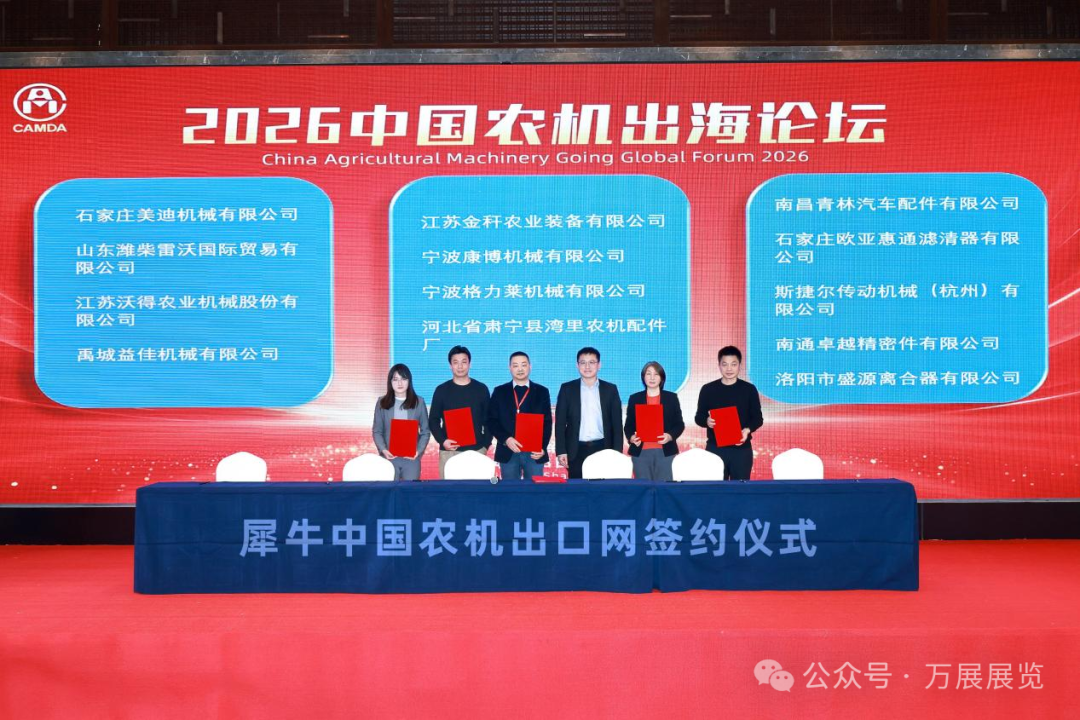 值得一提的是,2026年1月1日,万展展览正式上线境外农机产品线上外贸平台——犀牛中国农机出口网。据程世强介绍,截至2026年3月1日,预计有200家中国农机企业产品上线平台,其上线标志着万展展览已突破纯线下展会的宣传局限,可通过线上渠道助力更多中国农机企业跨越时间、地域与成本壁垒,向全球精准展示产品、拓展海外市场。论坛现场,包括山东雷沃、江苏沃得、石家庄美迪、禹城益佳、江苏金秆、宁波康博、宁波格力莱、河北湾里农机、南昌青林汽配、欧亚惠通、斯捷尔传动、南通卓越、洛阳盛源等13家企业,与犀牛中国农机出口网签订了合作意向。