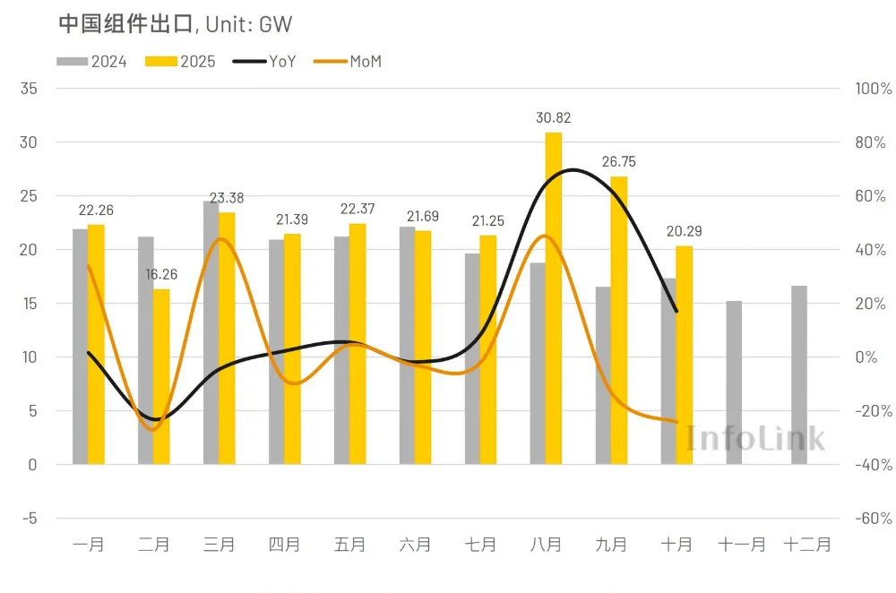 2025年,中国光伏出口量再创历史新高,但全行业陷入了史诗级的亏损。InfoLink数据显示,2025年1-10月,光伏组件出口量同比增长6%至11%(数据源不同),达约226.5 GW的历史高位。其中硅片、电池片和组件出口量分别同比增长8.3%、91.4%和6%。