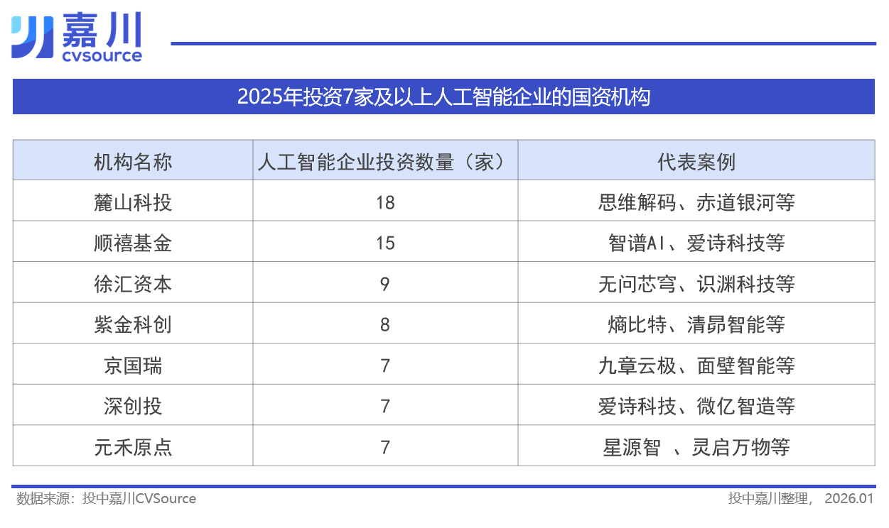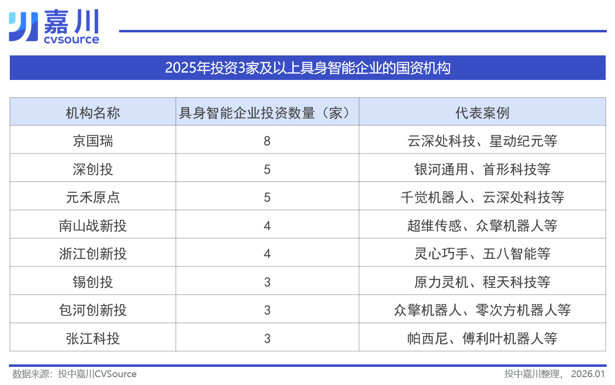 国资的投资地图与此高度重合。2025年,北京国资凭借其顶尖的科研资源与明确的产业政策独占鳌头,京国瑞通过其管理的百亿机器人产业投资基金,以投资8家具身智能企业的成绩领先,其基金超过一半的投资都流向了该领域,今年密集布局了云深处、星动纪元等公司。