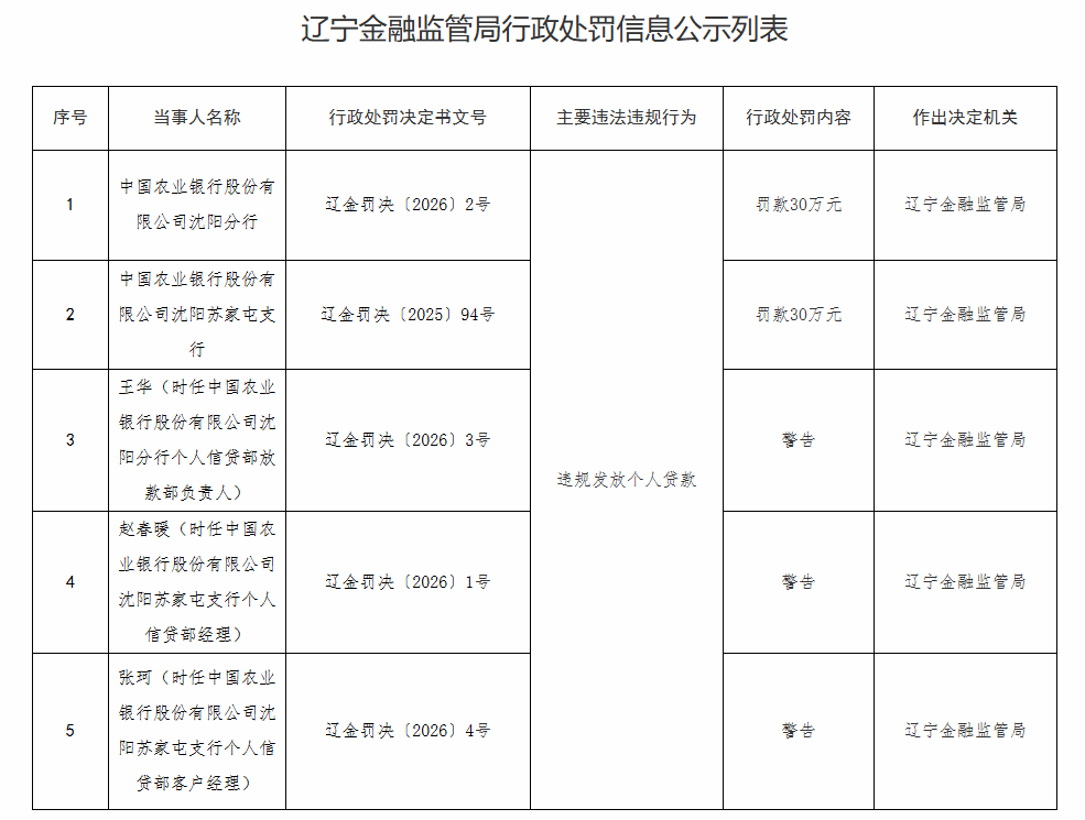 据辽宁金融监管局,因违规发放个人贷款,农业银行沈阳分行、沈阳苏家屯支行分别被罚30万。