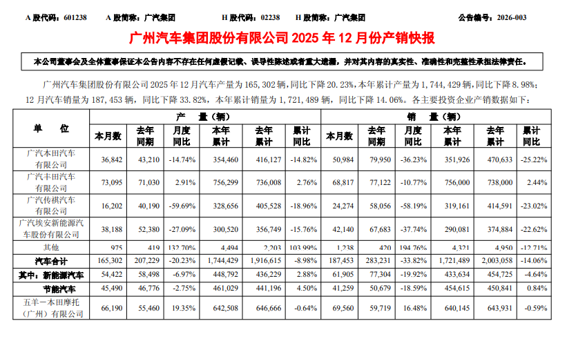 然而,与这份“闯过隘口”的笃定,形成鲜明反差的,是广汽集团交出的2025年成绩单:全年销量172.15万辆,尽管实现连续三个季度环比正增长,依然难掩14.06%的全年同比销量下滑;2025年前三季度归母净利润巨亏43.12亿元,创下近年业绩新低。