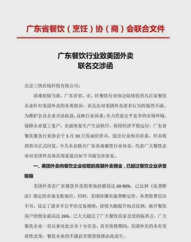 同年4月10日,广东33家餐饮行业协会曾联合向美团发出交涉函,要求其取消"独家合作限制"等垄断条款,降低外卖服务佣金等。