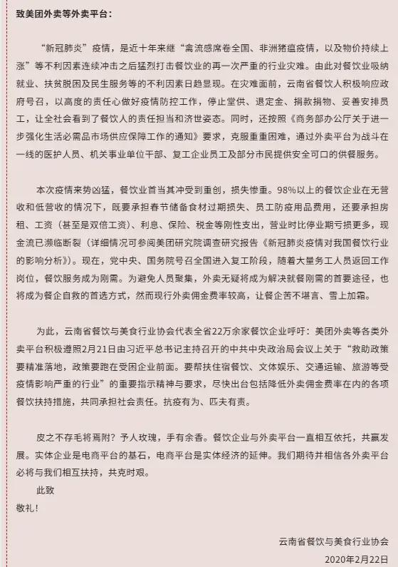 同年2月22日,云南省餐饮与美食行业协会在其官方微信上发布《云南省22万余家餐企致美团外卖等平台的公开信》其中直言,"现行外卖佣金费率较高,让餐企苦不堪言、雪上加霜。"