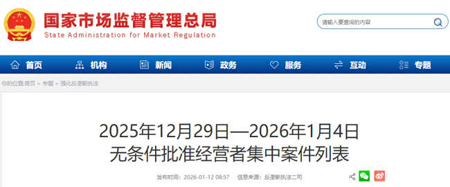 1月12日,国家市场监督管理总局,发布一批无条件批准经营者集中案件名单。