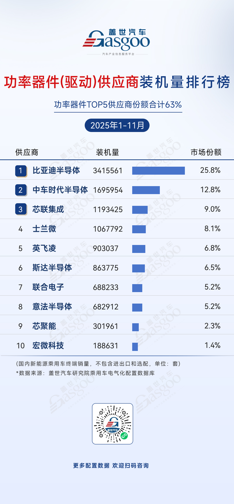 比亚迪半导体,2025年1-11月装机量3415561套,市场份额25.8%。