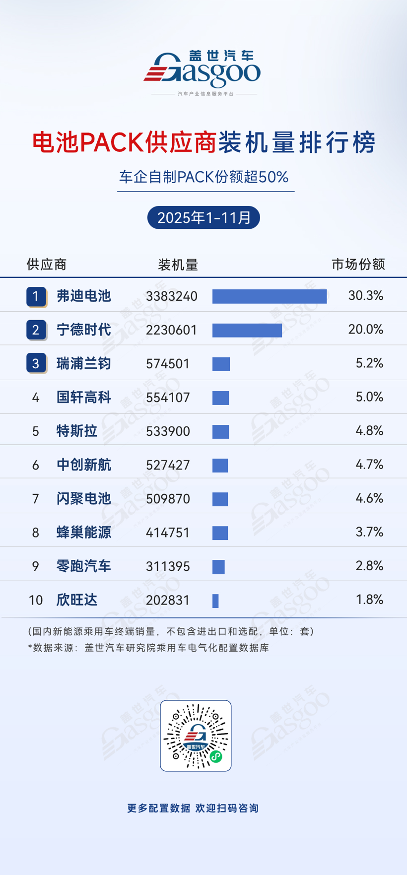 2025年1-11月电气化供应商装机量排行榜:车企自供比例提升,中小厂商细分突围