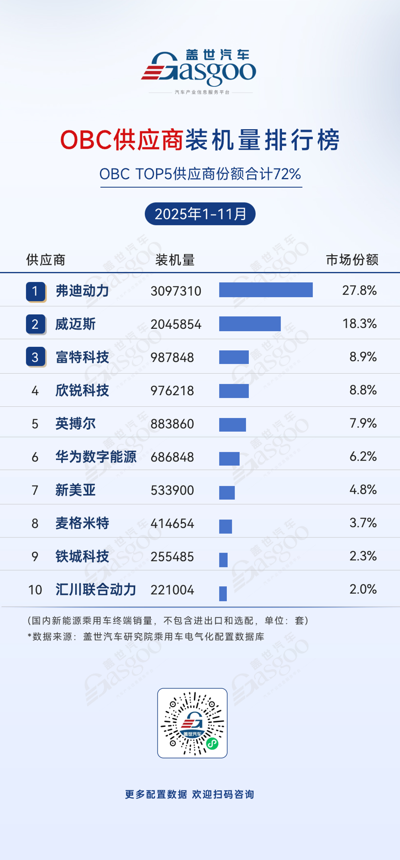 2025年1-11月OBC市场呈现“头部高度集中”的特征,TOP5供应商份额合计达72%:弗迪动力以309.73万套、27.8%的份额领跑行业,威迈斯以204.59万套、18.3%的份额紧随其后,二者共同构成第一梯队;富特科技、欣锐科技、英搏尔组成第二梯队,份额集中在7%-9%区间,凭借技术通用性服务多品牌客户,是OBC配套市场的重要补充力量。第六至第十名供应商的市场份额均低于6%,且呈逐步递减的态势,剩余市场被多元主体分散分食,中小厂商更多聚焦于特定车型或细分客户的配套需求,以差异化定位寻求生存空间。