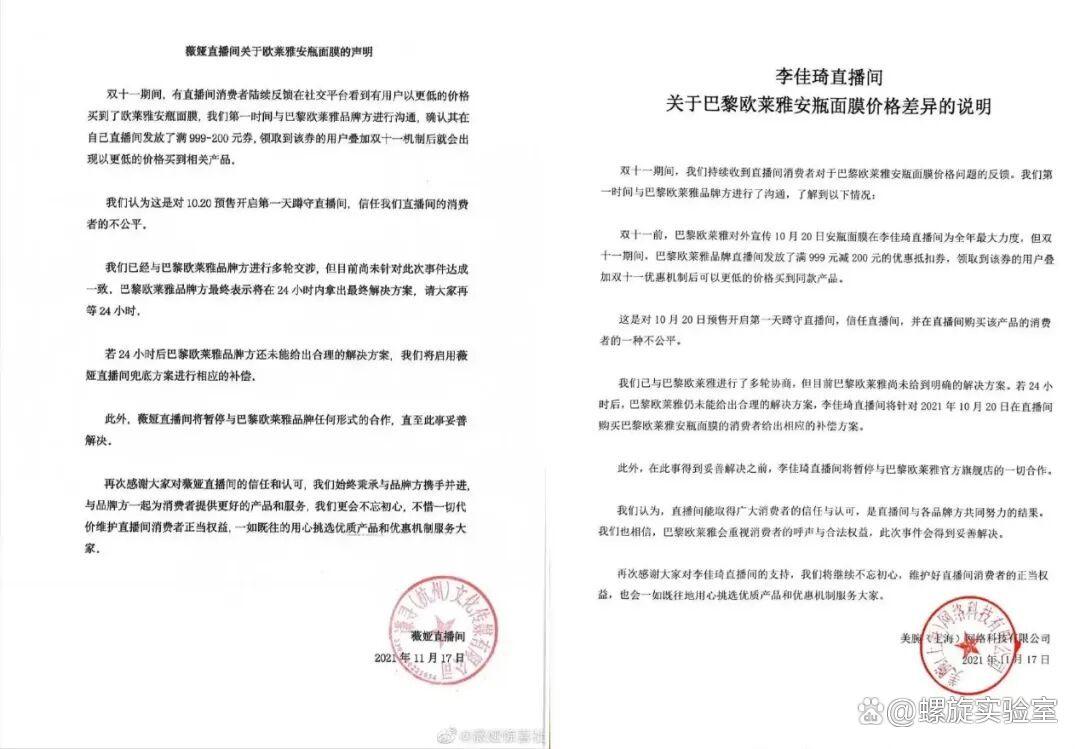 2021年,欧莱雅、蒂佳婷等品牌,就曾因官方直播间售价低于李佳琦、薇娅等头部主播直播间的价格,引发大量消费者投诉甚至集体退货。