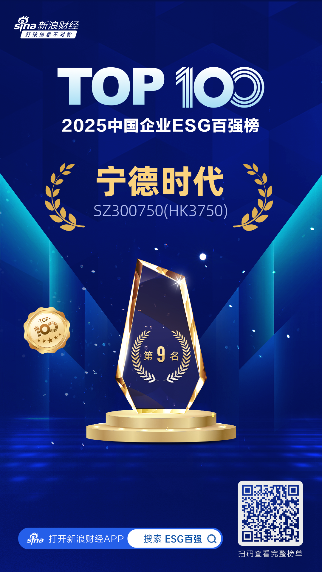 宁德时代在环境、社会、公司治理领域开展了大量工作,积累了丰富的创新实践与扎实的落地成果。凭借在ESG各领域的卓越表现,宁德时代成功入选本次新浪财经“2025中国企业ESG百强”榜单,并位列第9名。