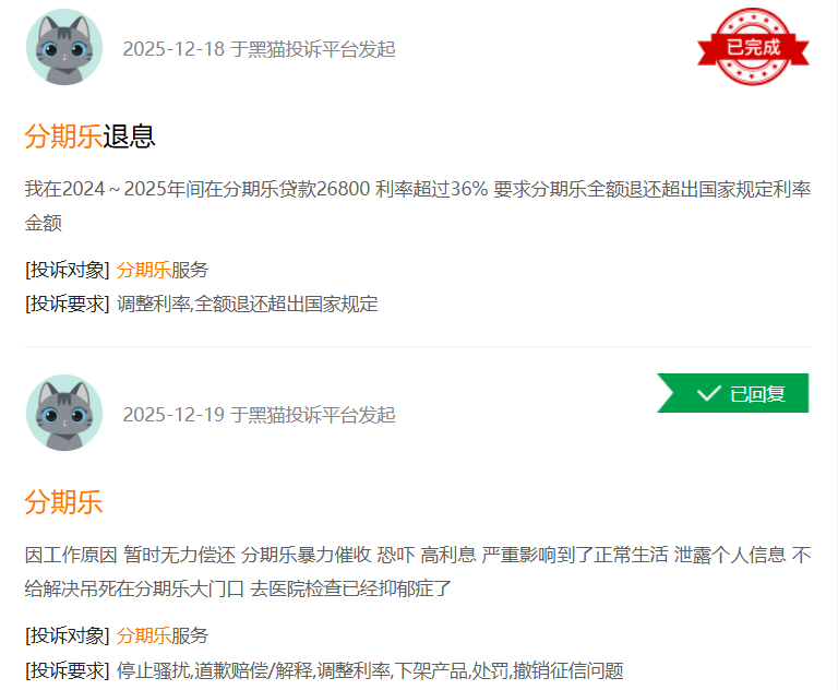 例如黑猫投诉上,一名用户在2025年12月24日投诉称,其“借了两次分期乐,一次6000多,一次4000多,其中每一期分期都收取了综合费用,收费也不明确”。