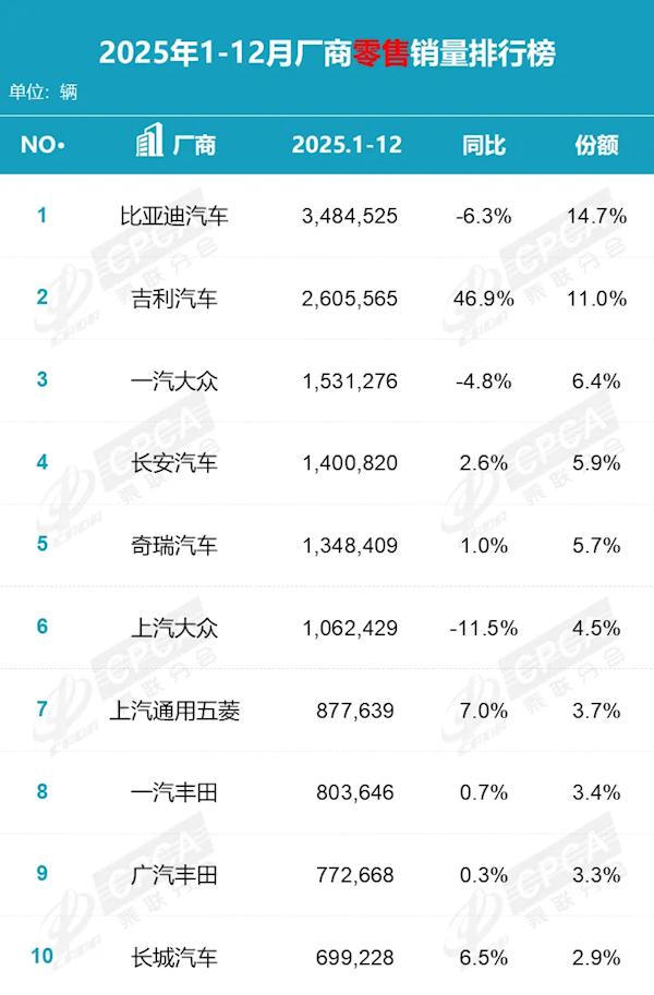 2025年汽车厂商销量榜:比亚迪断层式夺冠 前五国产车占四席