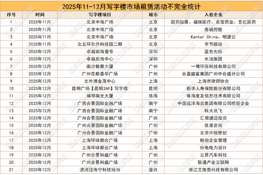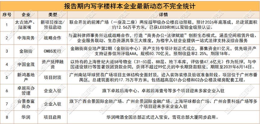 聚焦需求层面,据企业官微披露,11-12月期间,卓越商办管理、合景泰富商办、中海商务等旗下多个写字楼项目持续承接科技、金融、医药等高能级企业需求。
