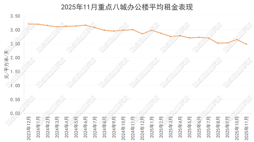 11月重点八城办公租金均值为2.48元/平方米/天,环比下跌6.28%,同比跌幅扩大至17.35%,较10月的同比跌幅11.15%扩大6.2个百分点,这一表现与行业基本面高度契合,全国办公楼竣工面积同比涨幅超10%,供应高峰集中兑现,短期内加剧租赁市场的竞争与空置压力,业主为去化不得不延续以价换量的策略。
