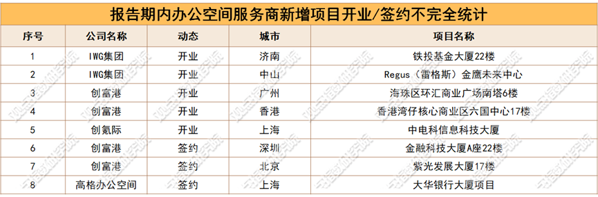 办公空间服务商表现上,据观点指数监测,本期新增签约/开业的项目共计8个,较上期显著下滑。本期样本企业中,以高格办公空间、IWG集团、创氪纪以及创富港为代表的头部企业有新项目落地或亮相。