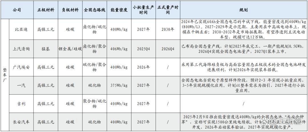 上汽清陶预计2025年投产,目标能量密度406Wh/kg,2027年装车上市。一汽、吉利、长安也是计划2027年小批量装车。