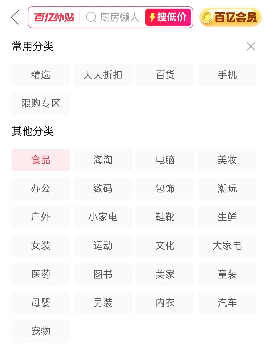 在小孟看来,这一设计的核心目的在于引导用户完成集中式采购:一方面以高频刚需品类作为流量抓手,持续激活用户复购。