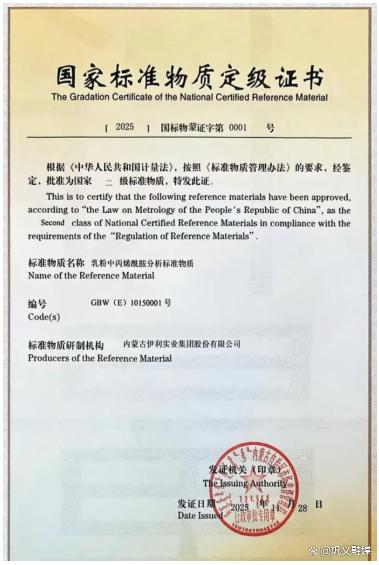 全区首家!伊利股份获内蒙古首张二级标准物质证书