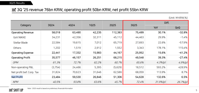 当然从业绩来看,Shift Up刚刚在2025 年第三季度交出了不错的成绩:公司营收 754.99 亿韩元(约合人民币3.6亿元),同比增长30.1%;净利润 546.28 亿韩元(约合人民币2.6亿元),同比增长132.6%。
