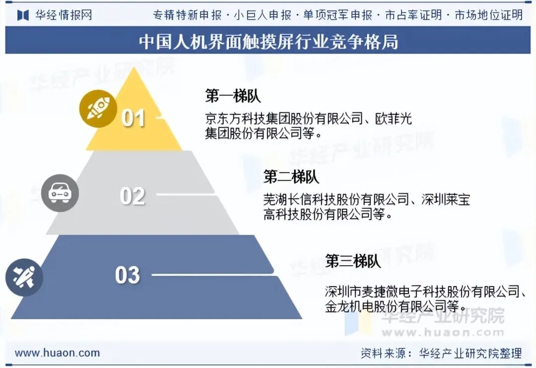 中国人机界面触摸屏行业竞争格局较为激烈,且有较强的技术壁垒,第一梯队公司为京东方科技集团股份有限公司、欧菲光集团股份有限公司;第二梯队公司为芜湖长信科技股份有限公司、深圳莱宝高科技股份有限公司;第三梯队公司为深圳市麦捷微电子科技股份有限公司、金龙机电股份有限公司。