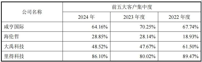 公司前五大客户集中度高于可比公司。海伦哲主营产品为高空作业车,高空作业车主要应用于电力、通信、园林和市政等领域,而非电力行业专用车辆,因此其客户集中度较其他可比公司偏低;大禹科技主营产品为电气控制与节能设备,主要应用于为新能源、冶金、石化、矿山、船舶、建材等领域大型企业,整体客户集中度偏低。