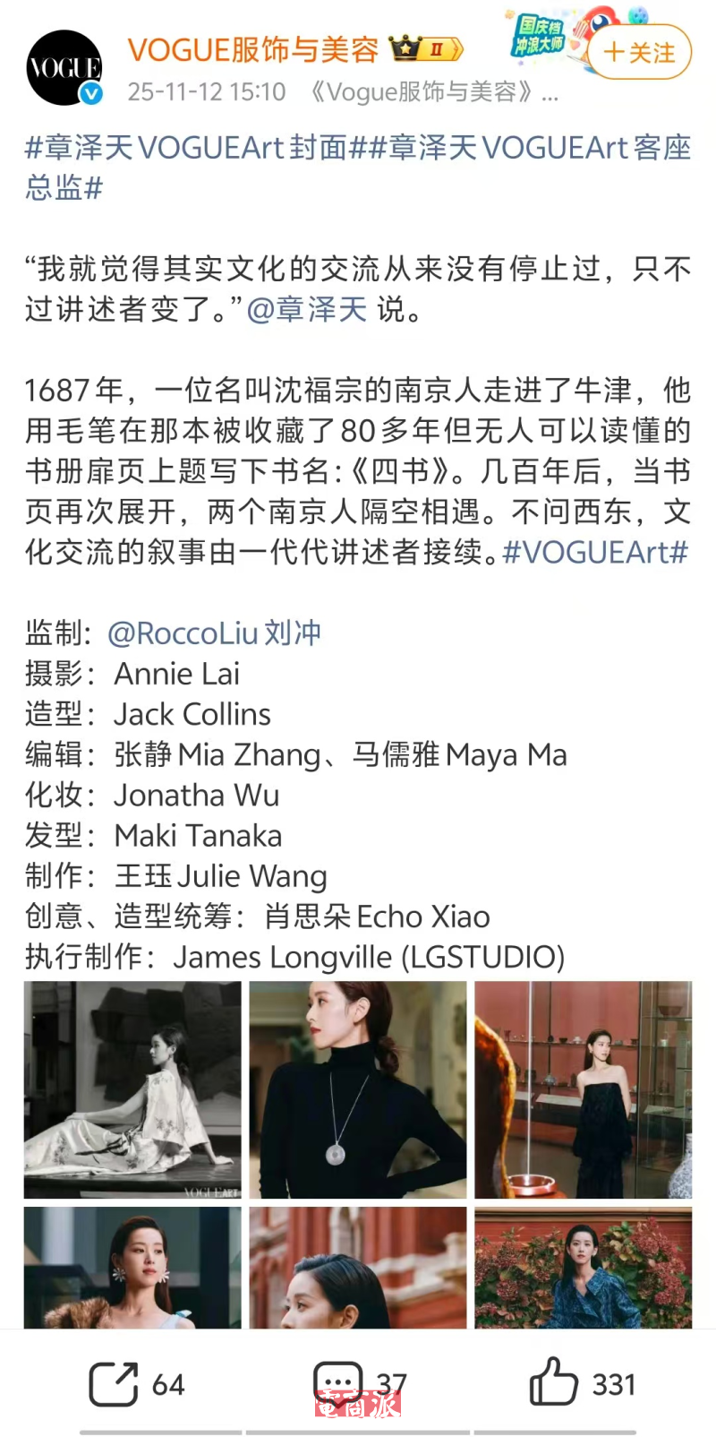 2025年11月12日,《VOGUE服饰与美容》杂志正式官宣,章泽天出任旗下艺术子刊《VOGUE Art》客座总监,同时登上该刊11月刊封面。