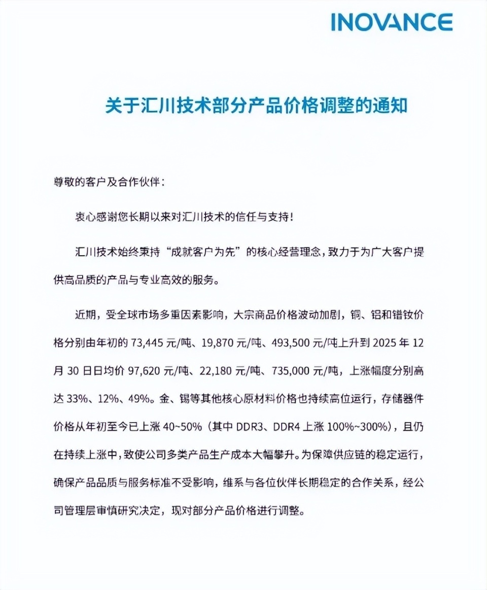 就在几天之前,国内著名的电机供应商汇川技术对外发布了涨价通知,决定对旗下部分产品进行价格调整,而所谓的价格调整,一般说来就是涨价了。而且汇川技术在通知中也表述了理由,2025年铜、铝等原材料价格大幅度上涨,有些上涨幅度甚至高达49%,而存储元件也从年初上涨了40%—50%,其中DDR3、DDR4上涨100%—300%,所以原材料的价格大幅度上涨,让汇川技术不得不做出价格调整的决定。