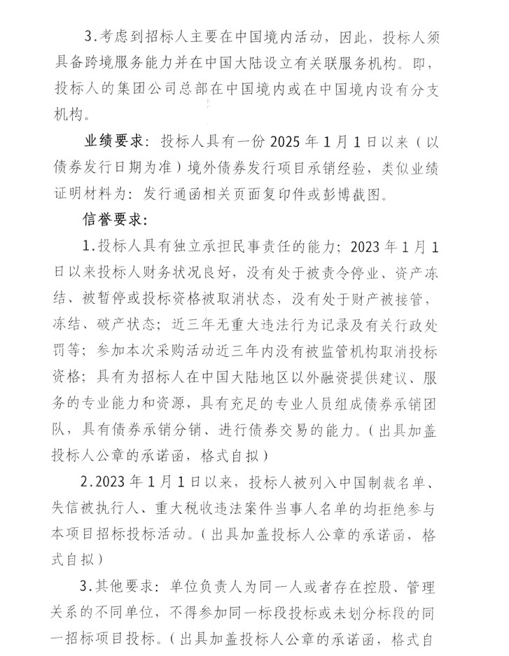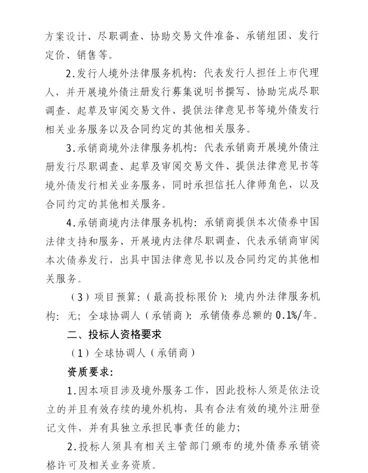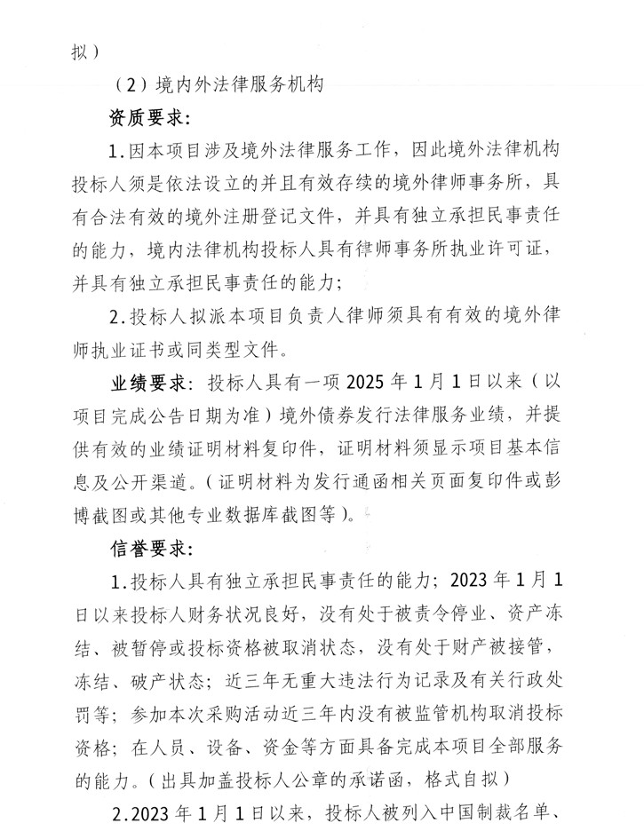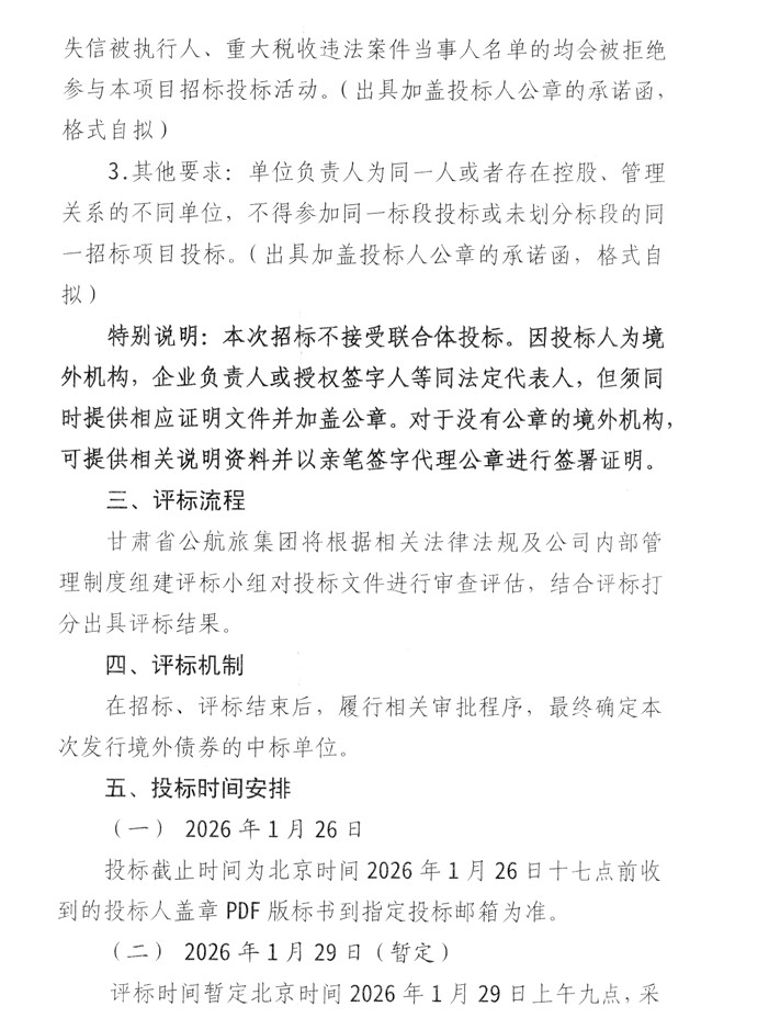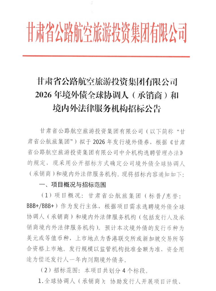 久期财经讯,1月12日,甘肃省公路航空旅游投资集团有限公司(简称“甘肃公航旅集团”)发布2026年境外债全球协调人(承销商)和境内外法律服务机构招标公告。
