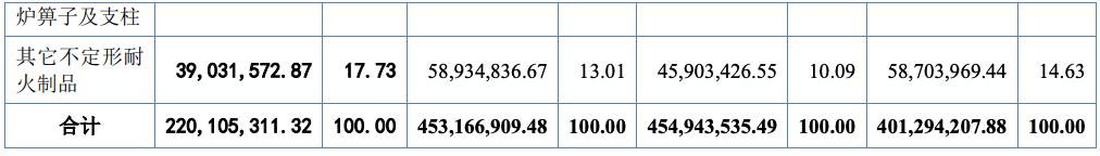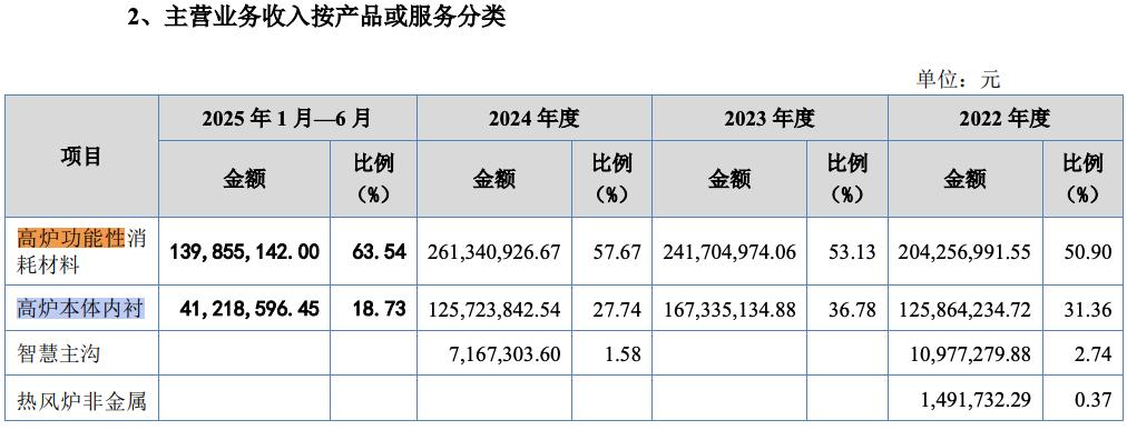 其次为高炉的“贴身防护甲”,高炉本体内衬,主要包括陶瓷杯和风口组合砖,直接贴附在高炉内壁,抵御高温和物料冲刷。属于“项目制产品”,仅在高炉新建或大修时采购,为第二大营收来源,占比在18.73%到31.36%之间。但因定制属性毛利率较高,报告期内最高达45.47%。