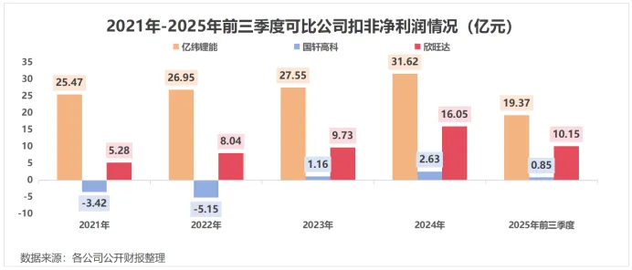 2025年前三季度,亿纬锂能营收迅猛增长,扣非净利润却下降超22%;国轩高科表面利润激增,但剔除投资奇瑞的股权收益后,主营盈利不足1亿元;欣旺达扣非净利润也同比下降了12.74%。