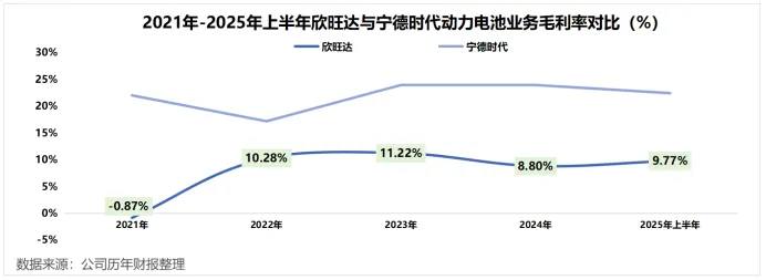 2022年受原材料成本上涨影响,电池企业的毛利率普遍下滑。但后来锂等原材料价格下滑,欣旺达动力电池毛利率并没有上升,2025年上半年仅为9.77%,远低于宁德时代动力电池系统22.41%的毛利率。