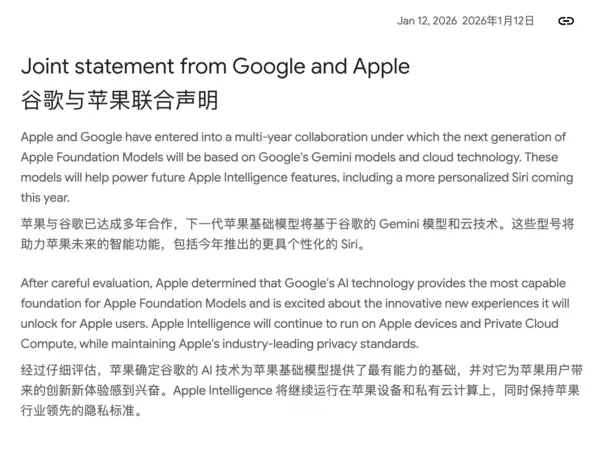 毕竟,史蒂夫·乔布斯当年曾誓言要对Android发动“热核战争”。但在最近,谷歌官方的一篇声明,正式宣告了在AI时代下,谷歌与苹果这两个对手,将完成一次相当务实的联姻。