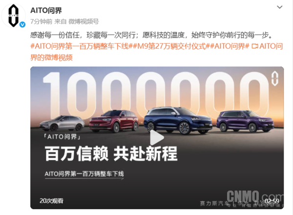 1月13日,AITO问界官方微博正式宣布,问界汽车的第一百万辆整车已成功下线。与此同时,问界M9也举办了第27万辆的交付仪式。官方还发布“感谢每一份信任,珍藏每一次同行;愿科技的温度,始终守护你前行的每一步”的主题视频。