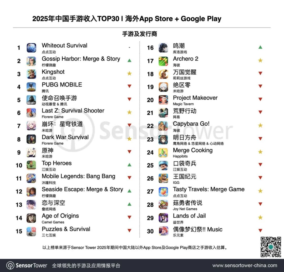 2025年《Kingshot》、《Last Z: Survival Shooter》、《Dark War Survival》、《Archero 2》、《Capybara Go!》、《Merge Cooking》、《Tasty Travels: Merge Game》、《Lands of Jail》等共8款游戏首次入围出海手游收入榜TOP30。