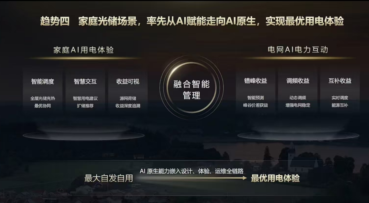 随着AI技术快速演进,家庭光储场景将率先从AI赋能走向AI原生,将最大自发自用的基础需求升级为最优用电体验的主动策略。